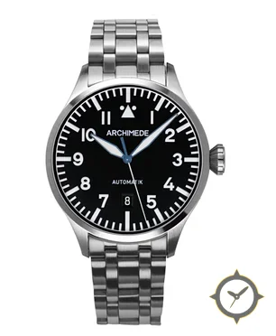 A Pilot watch with a vintage-inspired 35mm case, crafted from stainless steel featuring a black dial with a unique matte finish.