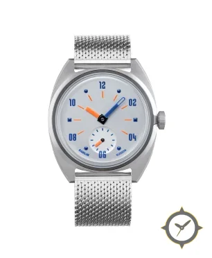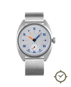 A Minimalist watch with a vintage-inspired 29.5mm case, crafted from stainless steel featuring a silver dial with a unique matte finish.