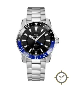 A GMT watch with a vintage-inspired 37mm case, crafted from stainless steel featuring a black dial with a unique matte finish and a true GMT complication for tracking a second time zone.