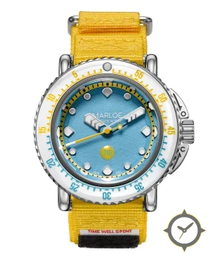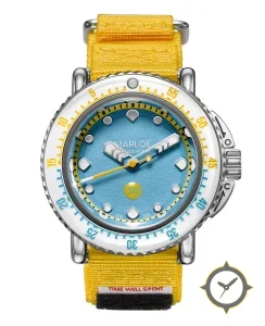 A Dive watch with a vintage-inspired 35.5mm case, crafted from stainless steel featuring a turquoise dial with a unique grained/pebbled texture finish.