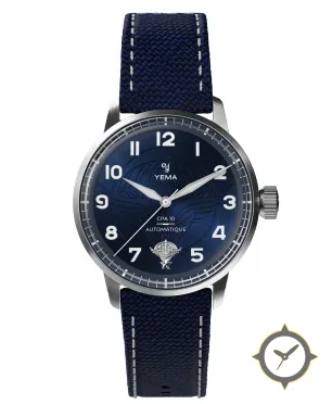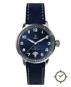 A Military watch with a bold 47.5mm presence on the wrist, crafted from stainless steel featuring a blue dial with a unique sunburst with embossed emblem finish.