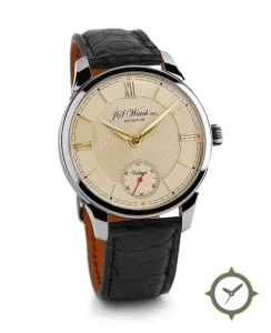 A Dress watch with a versatile 39mm case, that suits most wrists, crafted from stainless steel featuring a gold dial with a unique guilloché (engine-turned) center with matte outer ring finish.
