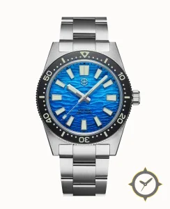 A Dive watch with a vintage-inspired 37mm case, crafted from stainless steel featuring a blue dial with a unique wave finish.