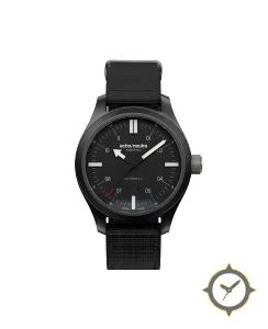 A Tactical watch with a vintage-inspired 36.5mm case, crafted from stainless steel featuring a black dial with a unique matte finish.