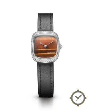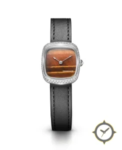 A Luxury watch with a vintage-inspired 27.5mm case, crafted from stainless steel featuring a brown dial with a unique tiger's-eye stone (chatoyant) finish.