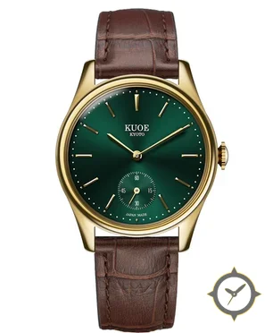 A Dress watch with a vintage-inspired 28mm case, crafted from gold featuring a green dial with a unique sunburst finish.