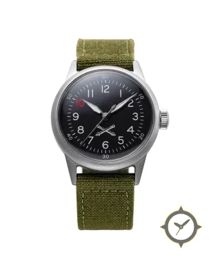 A Field watch with a vintage-inspired 37mm case, crafted from stainless steel featuring a black dial with a unique matte finish.