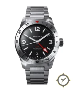 A GMT watch with a bold 42mm presence on the wrist, crafted from stainless steel featuring a black dial with a unique matte finish and a true GMT complication for tracking a second time zone.