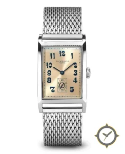 A Dress watch with a vintage-inspired 23.5mm case, crafted from stainless steel featuring a gold dial with a unique sunburst finish.
