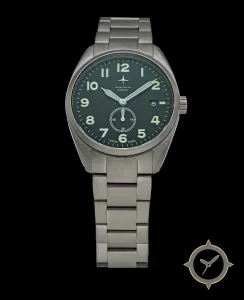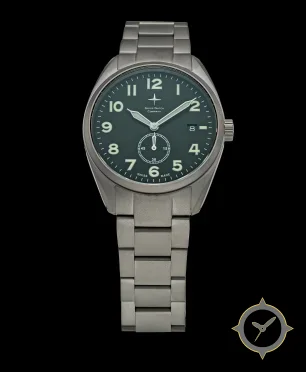 A Field watch with a vintage-inspired 36.5mm case, crafted from titanium featuring a green dial with a unique matte finish.