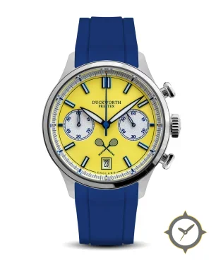 A Chronograph watch with a vintage-inspired 33.5mm case, crafted from stainless steel featuring a blue dial with a unique smooth lacquer finish.