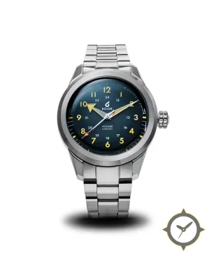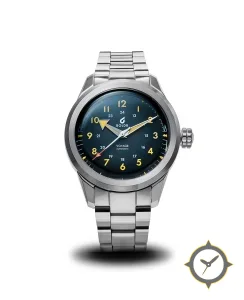 A GMT watch with a vintage-inspired 35mm case, crafted from stainless steel featuring a blue dial with a unique sunburst finish and a true GMT complication for tracking a second time zone.