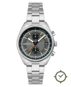 A Chronograph watch with a versatile 41mm case, that suits most wrists, crafted from stainless steel featuring a gray dial with a unique textured (grained) finish.