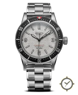 A Dive watch with a vintage-inspired 36.5mm case, crafted from stainless steel featuring a white dial with a unique grained/textured (snow-like) finish.