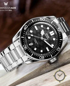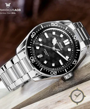 A Dive watch with a bold 43.5mm presence on the wrist, crafted from stainless steel featuring a black dial with a unique textured geometric (herringbone/waffle) finish.