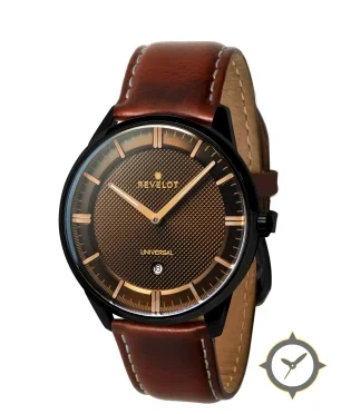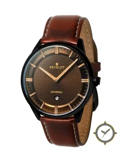 A Dress watch with a versatile 38.5mm case, that suits most wrists, crafted from stainless steel featuring a brown dial with a unique hobnail / guilloche textured center with concentric brushed ring finish.