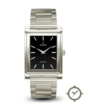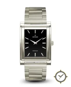 A Dress watch with a vintage-inspired 26.5mm case, crafted from stainless steel featuring a black dial with a unique smooth/glossy finish.