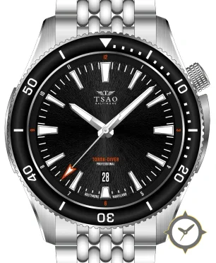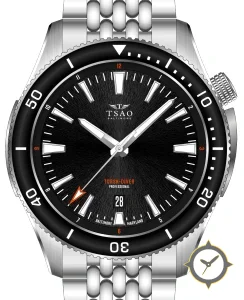 A Dive watch, crafted from stainless steel featuring a black dial with a unique sunburst (radial brushed) finish.
