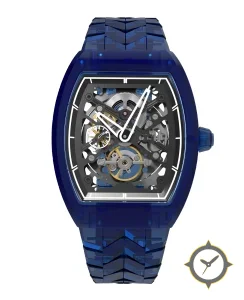 A Skeleton watch, crafted from sapphire featuring a black dial with a unique skeletonised/open-worked metallic finish finish.