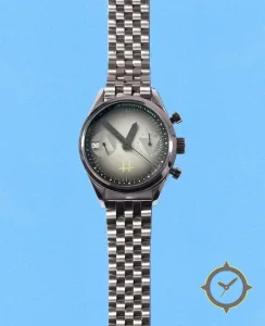 A Chronograph watch with a vintage-inspired 35.5mm case, crafted from stainless steel featuring a gray dial with a unique sunburst gradient (fumé) finish.