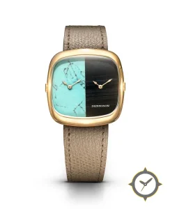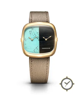 A GMT watch with a vintage-inspired 27mm case, crafted from gold featuring a turquoise dial with a unique turquoise/stone (marbled) finish and a true GMT complication for tracking a second time zone.