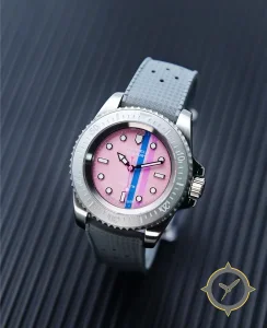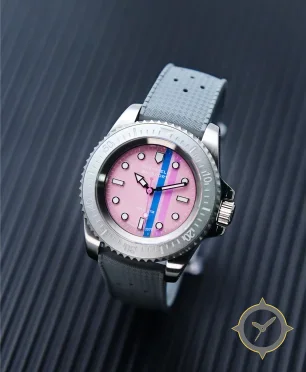 A Dive watch with a bold 42.5mm presence on the wrist, crafted from stainless steel featuring a crimson dial with a unique matte finish.