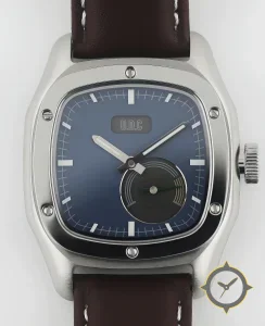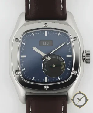 A Driver watch with a vintage-inspired 33.5mm case, crafted from stainless steel featuring a blue dial with a unique smooth matte finish.