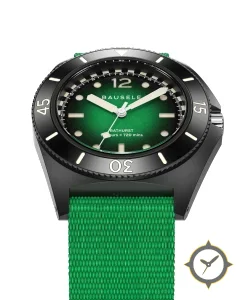 A Dive watch with a vintage-inspired 34.5mm case, crafted from stainless steel featuring a green dial with a unique sunburst / gradient (fumé) finish.