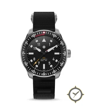 A Dive watch with a bold 46mm presence on the wrist, crafted from stainless steel featuring a black dial with a unique matte finish.