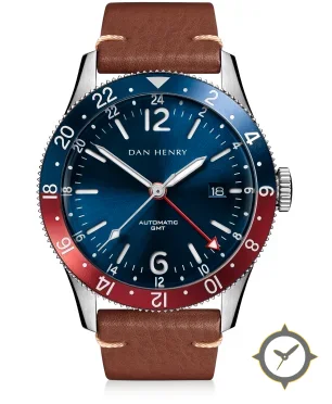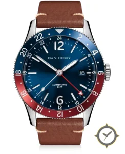 A GMT watch with a vintage-inspired 36mm case, crafted from stainless steel featuring a blue dial with a unique sunburst finish and a true GMT complication for tracking a second time zone.