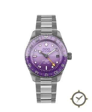 A GMT watch with a versatile 40mm case, that suits most wrists, crafted from stainless steel featuring a purple dial with a unique textured gradient (grainy finish) finish and a true GMT complication for tracking a second time zone.
