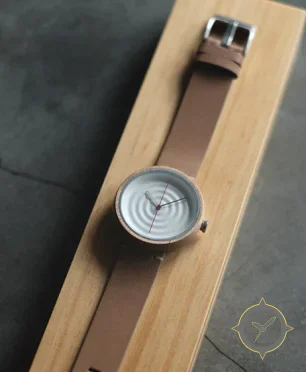 A Minimalist watch with a vintage-inspired 32mm case, crafted from bronze featuring a silver dial with a unique concentric ripple texture finish.