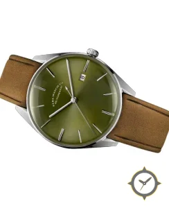 A Dress watch with a vintage-inspired 34mm case, crafted from stainless steel featuring a green dial with a unique sunburst finish.