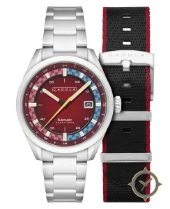 A Sports watch with a bold 42mm presence on the wrist, crafted from stainless steel featuring a red dial with a unique sunburst gradient finish.