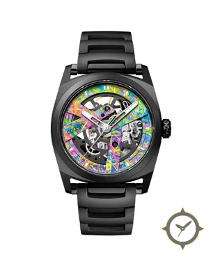 A Skeleton watch with a vintage-inspired 37mm case, crafted from stainless steel featuring a turquoise dial with a unique skeletonized with multicolor abstract print finish.