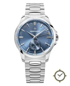 A Luxury watch with a vintage-inspired 33.5mm case, crafted from stainless steel featuring a blue dial with a unique sunburst finish and a helpful power reserve indicator.