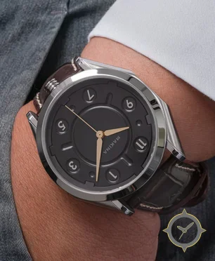A Dress watch with a bold 49mm presence on the wrist, crafted from stainless steel featuring a black dial with a unique matte with recessed concentric rings finish.