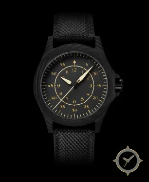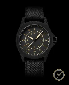 A Pilot watch with a vintage-inspired 34.5mm case, crafted from carbon featuring a black dial with a unique matte finish.
