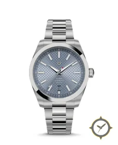 A Sports watch with a versatile 40mm case, that suits most wrists, crafted from stainless steel featuring a blue dial with a unique waffle / diamond-grid (clous de Paris) finish.