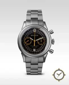 A Chronograph watch with a bold 47.5mm presence on the wrist, crafted from stainless steel featuring a black dial with a unique lacquer (glossy) finish.