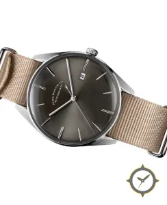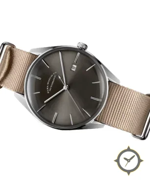 A Dress watch with a bold 42mm presence on the wrist, crafted from stainless steel featuring a gray dial with a unique sunburst finish.