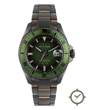 A Dive watch with a bold 46mm presence on the wrist, crafted from stainless steel featuring a green dial with a unique sunburst / fumé gradient finish.