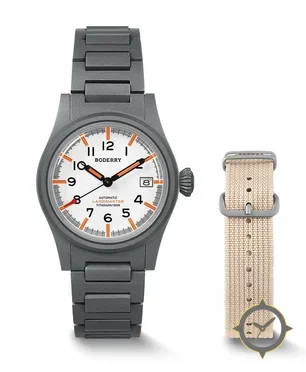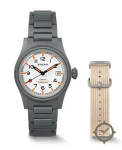 A Field watch with a vintage-inspired 35.5mm case, crafted from titanium featuring a white dial with a unique matte/textured finish.