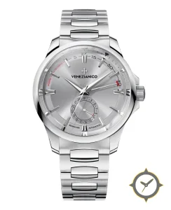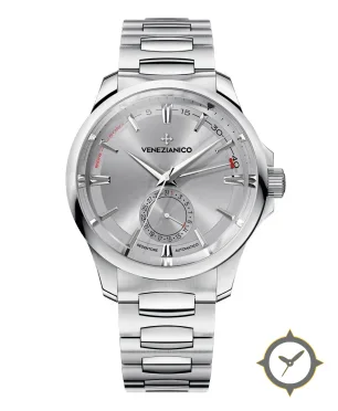 A Luxury watch with a vintage-inspired 36.5mm case, crafted from stainless steel featuring a silver dial with a unique sunburst/rotating-sheen finish and a helpful power reserve indicator.