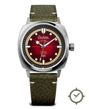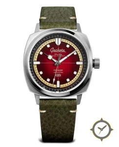A Field watch with a vintage-inspired 34mm case, crafted from stainless steel featuring a red dial with a unique sunburst finish.