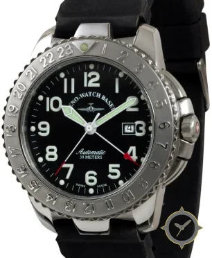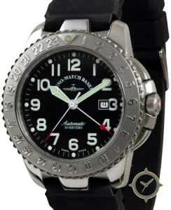 A GMT watch, crafted from stainless steel featuring a black dial with a unique matte finish and a true GMT complication for tracking a second time zone.