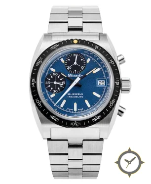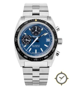 A Chronograph watch with a versatile 39mm case, that suits most wrists, crafted from stainless steel featuring a blue dial with a unique textured/grain (matte) finish.