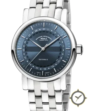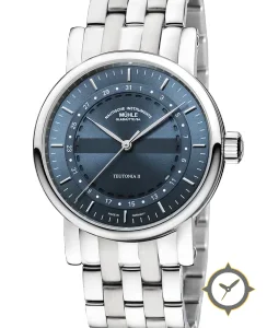 A Dress watch with a vintage-inspired 34.5mm case, crafted from stainless steel featuring a blue dial with a unique sunburst / radial finish finish.