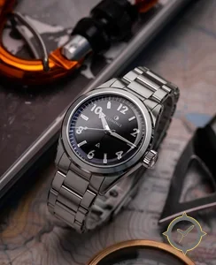A Field watch with a vintage-inspired 37mm case, crafted from stainless steel featuring a black dial with a unique sunburst/gradient finish.