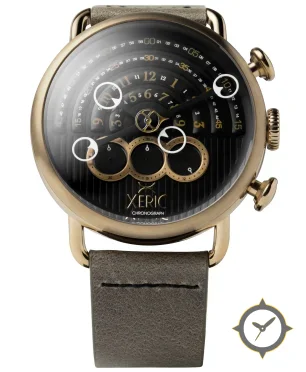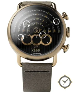 A Chronograph watch with a bold 45.5mm presence on the wrist, crafted from gold featuring a black dial with a unique concentric stepped rings on upper half with vertical ribbed texture on lower half finish.